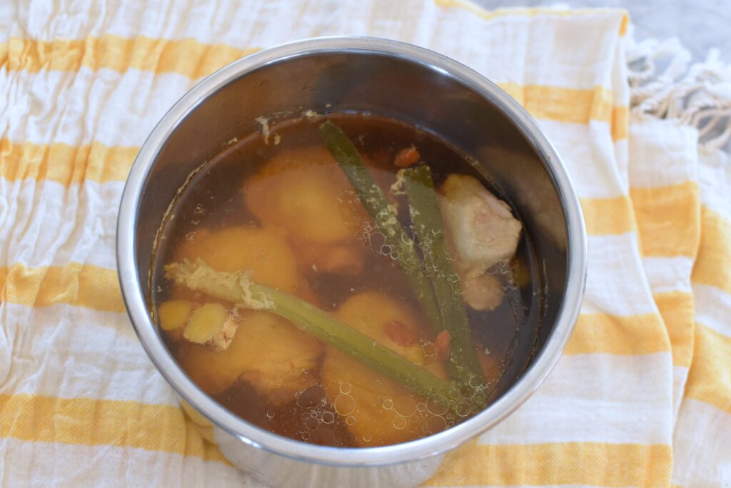 While my mom’s my mom’s whole-chicken soup will always be the gold standard, this version is my “Modern Mom” essential. Using chicken thighs means you don’t have to do anything at all to prep the chicken. It simply goes into the pot with water and some aromatics. If you want the deep benefits of a traditional confinement soup, but you are navigating life with a newborn, this Instant Pot version of an herbal chicken soup extracts the vital collagen and amino acids with just five minutes of prep time and yields a thousand times more taste and nourishment than anything you can buy in a grocery store.